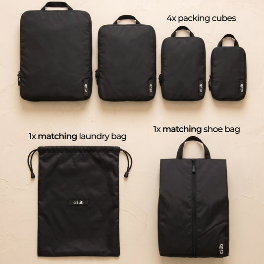 The complete ciúb travel system. Compression packing cubes, bundles, wash bags, hip packs and backpacks. Everything designed to work together.